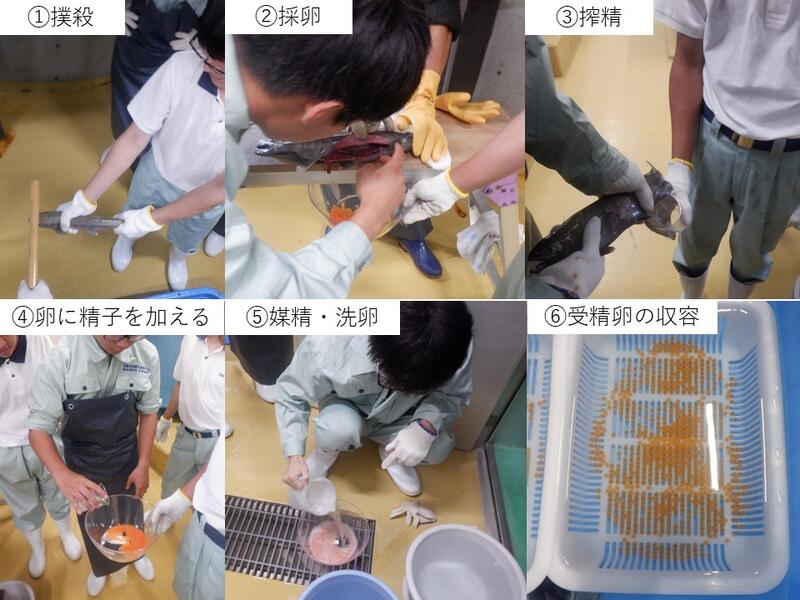 卵に精子をかけて混ぜ合わせ、水を加えることで授精します。余分な精子は水で洗い流し、孵化水槽に収容します。