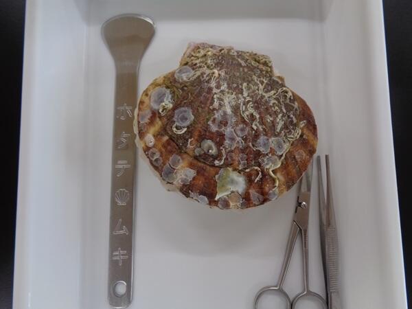 生徒たちは1人1枚ずつ与えられたホタテガイをほたてむきと解剖はさみを使い