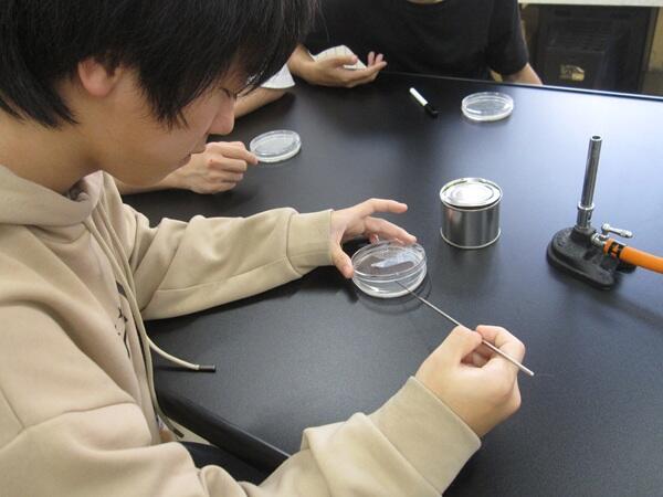 食品管理A、科目内実験の第2回。本日の前半は、前回各自で分注・作成した寒天培地の観察。残念ながら半数の生徒の培地でコンタミネーション(雑菌混入)が見られた結果となりましたが、「何故そうなったか」を考察するのも実験の醍醐味です。シャーレ蓋の開閉場所付近にコロニーが集中していることより、原因は空気流動での混入ではないかと考察しました。