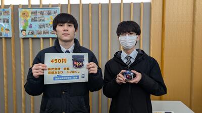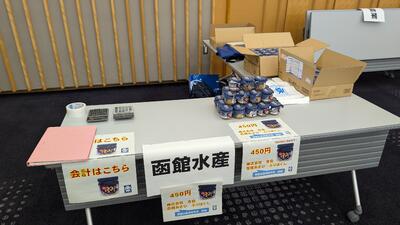 他校の発表や講演会を聞き、その後企業とのタイアップ商品のPR・販売となり、本校から株式会社合食様とタイアップさせていただきました「函館あさひ ぶりほぐし」を販売させていただきました。