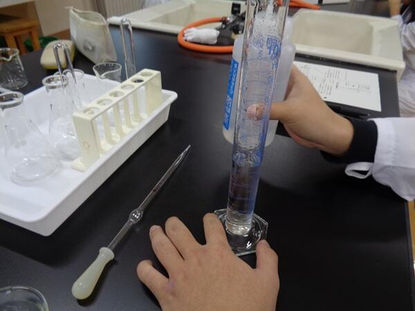安全な実験の心構えを考えながらメニスカスを読み正しく計量する手順などに取り組みました。