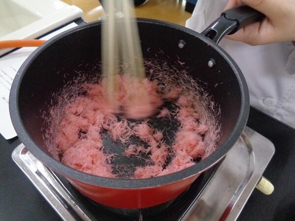 桜でんぶ 投稿日時 : 02/19 品質管理流通科 品質管理流通科2年生は食品サイエンス実習で桜でんぶ作りに取り組みました。 桜でんぶは漢字では桜田麩と書きその鮮やかなピンク色とほのかな甘みが特徴の ちらし寿司やお弁当などに使用される日本の伝統食品です。 しかしその原料が「魚肉」であることはあまり知られていません。 今回はゆでた真ダラの身に砂糖・みりん・塩で味付けしピンク色に着色したのですが 生徒たちは鍋で焦がさないように煎る作業に苦労していました。 ちなみにアジア圏ででんぶと言えば肉で作るものがほとんどですが 魚食文化の日本では魚が用いられています。 Tweet {{options.likeCount}} {{options.likeCount}}