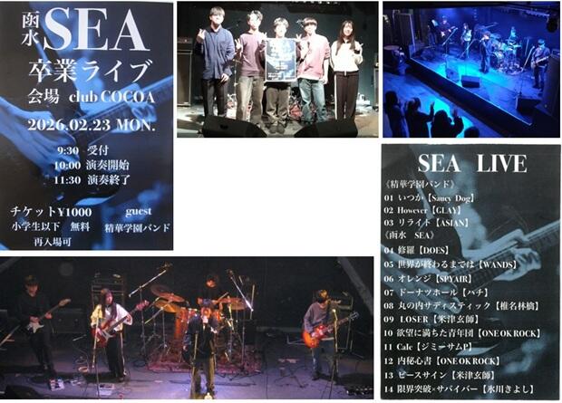 本日2/23(月)、函館クラブココアにおいて標記イベントを行いました。卒業を控えた3年生部員の保護者様より企画・運営いただいた、3年生のためのイベントです。至れり尽くせりな状況、そしてこれまでの恩返しとして、3年間で演奏してきたほとんどの楽曲と、新曲2つを加えた全11曲の演奏で恩(音)返しです。ちなみに、本校ドラマーはゲストバンド(精華学園函館校)でも3曲叩いております。
